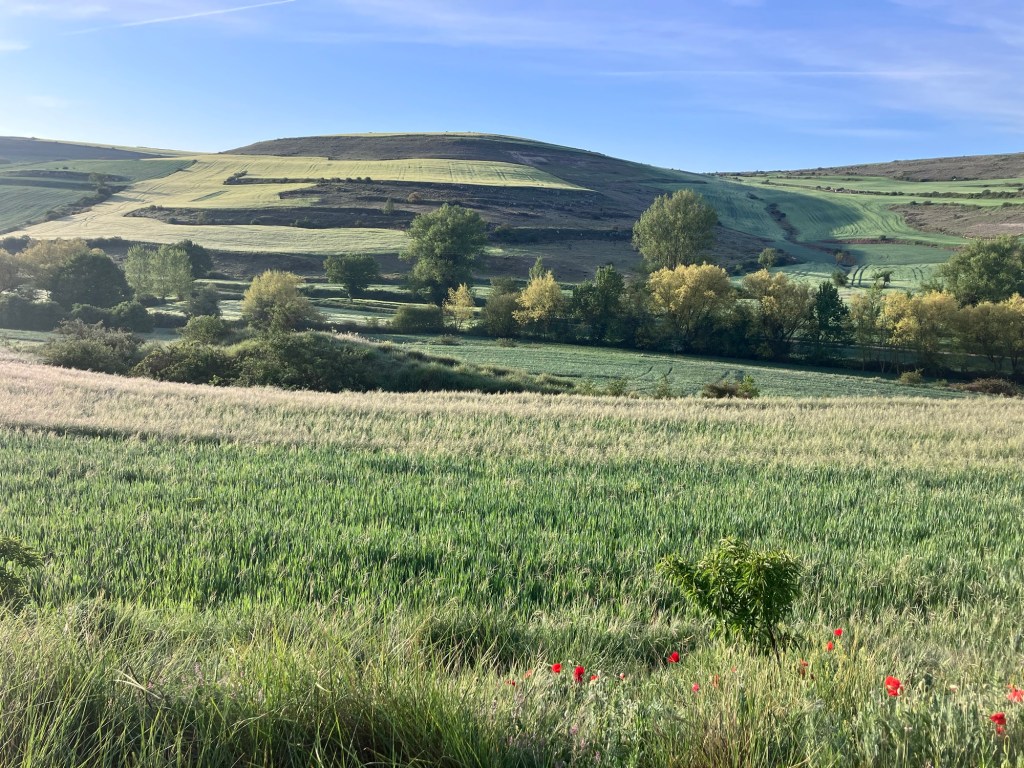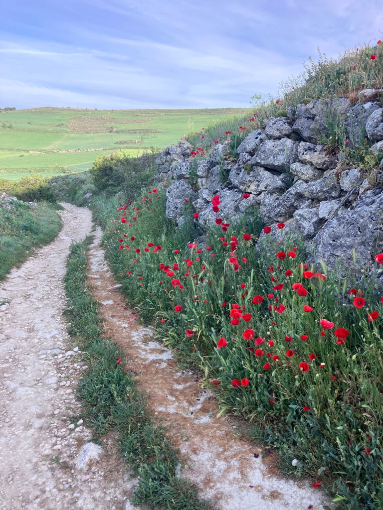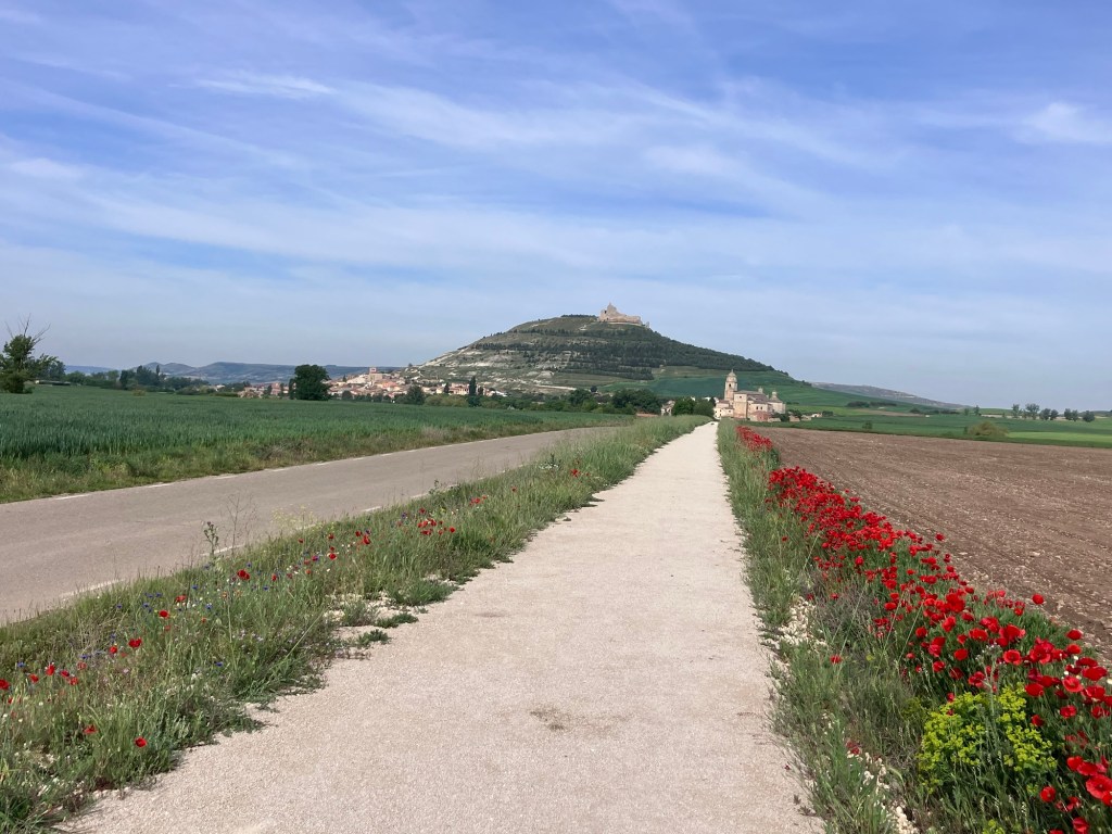 Round the corner, Castrojeriz came into view in the distance, and slowly (due to that interminable weight in my bag) got closer and closer. The poppies along the edge of the path were the thickest I have ever seen them grow.