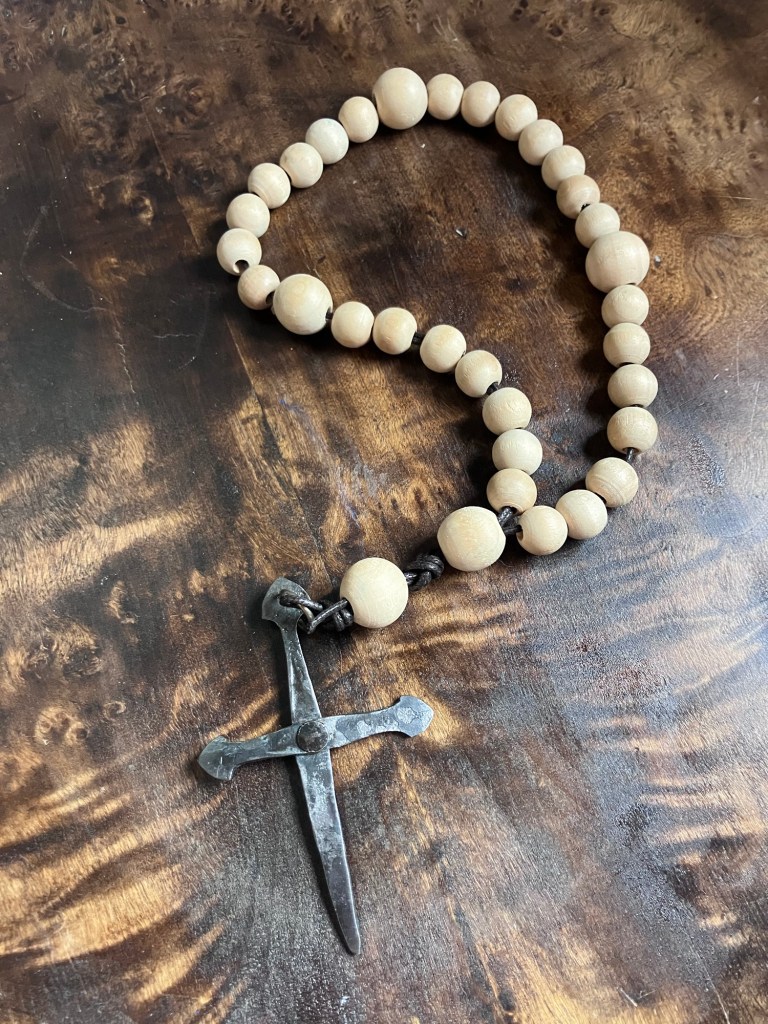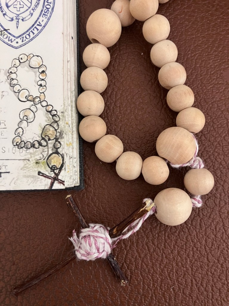 I had made them at home before I left, including making the cross out of twigs from one of our apple trees, but the cord broke after a few weeks and I had left the beads all lying in my bumbag. When I came across an ironmonger, I picked out a cross and asked if he would put a hole in it and he offered a leather thong as well, so I remade the loop. Just like I will always associate cow bells with the Via de la Plata or Pharrell Williams’ song “Happy” with our 2014 fundraising walk for charity:water, I will carry the memories of the many places I have fingered these beads on this solo Camino as I continue the practice of using them in my life back home.
