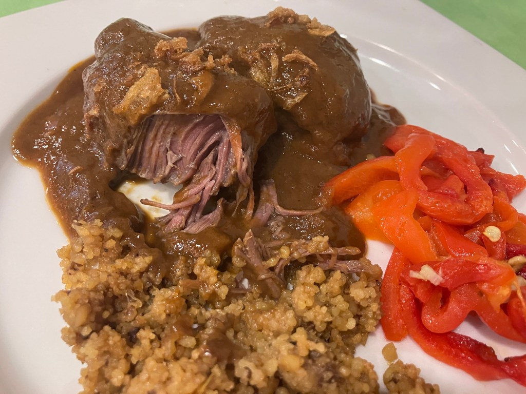 To be honest, had I known the the lasagna would be made with mushrooms in a gravy rather than a tomato-y mince sauce, I probably would have chosen the stuffed scallops or rye-stuffed tomatoes with garlic, but the four cheese sauce on top was exquisite. The second plate was phenomenal! The beef cheeks were so tender you only had to nudge them with your cutlery and they fell apart into the rich red wine sauce. I can take or leave most pieces of meat, but I will remember this dish forever! I asked the chef afterwards how he prepared the couscous; it was the most delicious I have ever tasted. The list of ingredients he reeled off would have been hard to remember even if he’d said them in English – all I can recall now are a variety of nuts, finely chopped onion and garlic, stock, beer, red peppers, a little tomato, salt, cumin, cinnamon, paprika, a variety of herbs like parsley and others I didn’t catch – apparently it’s all about making it taste good. A true chef!