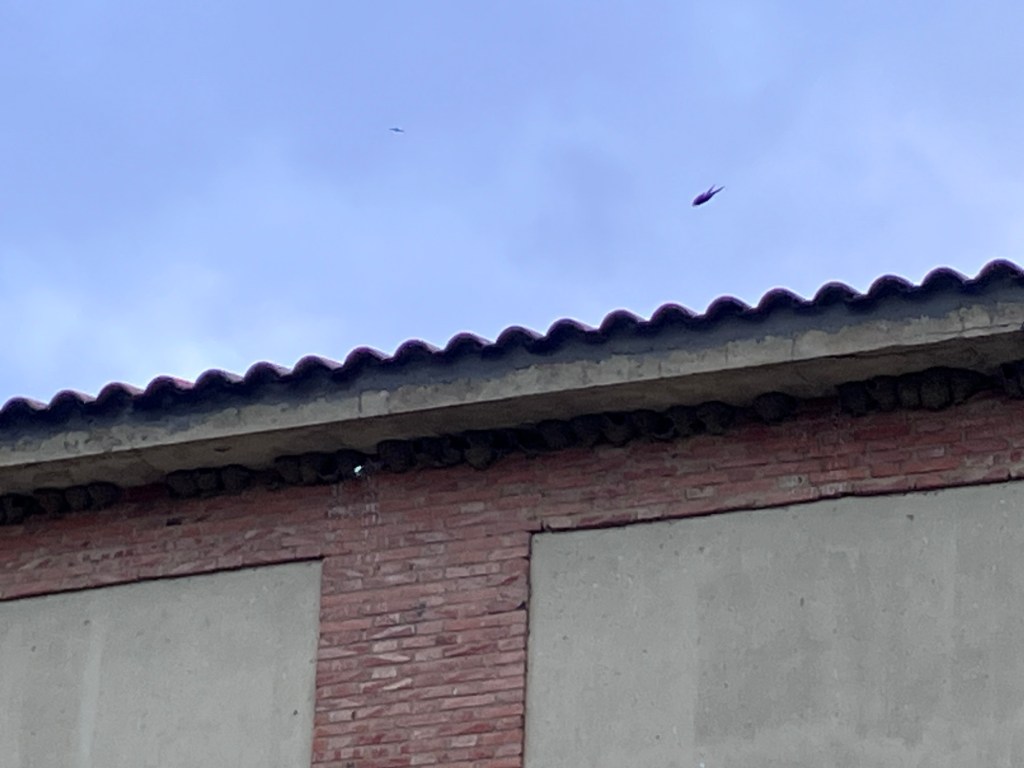 So when I saw a flock of birds doing marvellous acrobatics as I was leaving town this morning I had to stop and watch. Last time I tentatively identified birds on this blog I got it wrong (griffin vultures, not kites it turned out), but this time I am pretty certain they were swifts, and in case you didn’t know, a flock of them is called a scream. And they do. If I hadn’t taken the time to watch them I probably wouldn’t have noticed that they had a whole community of nests in the eaves of this magnificent building: