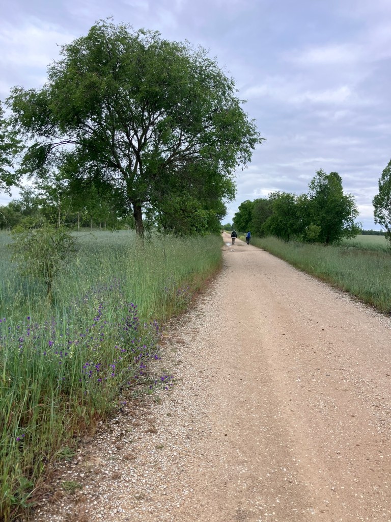 …because yet another Kiwi came up behind me and slowed a bit. He and his wife are veterans of a number of routes and had not expected to walk the Francés again, but their 18-year-old grandson, who lives in Australia, asked if they would walk with him. How could they say no? I increased my pace a bit, and at the same time offered that Grandpa go ahead and catch up with his family, but he stayed with me, and it made that last stretch fly by. We both knew that the village would suddenly appear over the edge of the road, so when we saw pilgrims ahead of us dropping out of view we knew we were close!