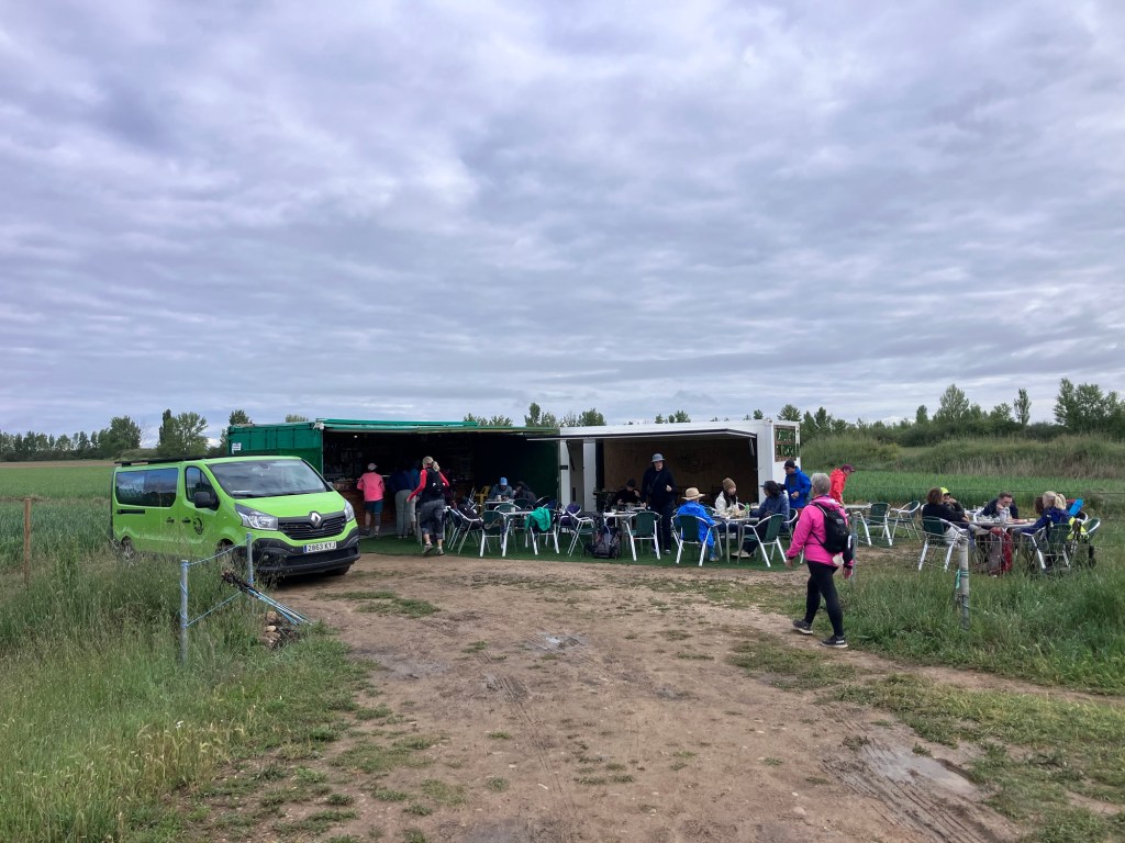 In the first half I walked alone, except for one Kiwi guy who slowed to chat for a wee while. But then he, like everyone else, strode past me. My plan was to walk slowly, which definitely reduces stress on the Achilles. Seeing so many people walk without their packs made me wonder if it would have been sensible to send it on with the baggage transport just for today, but I hadn’t. I did, however, plan to sit down whenever I could – on the side of a bridge, on a bench, on a roadside barrier….and at this pop-up cafe.