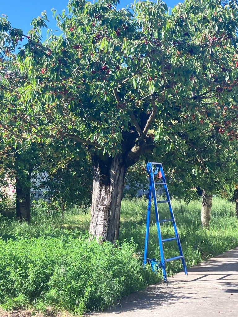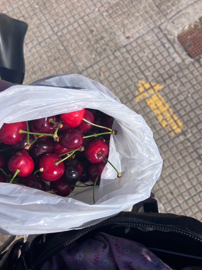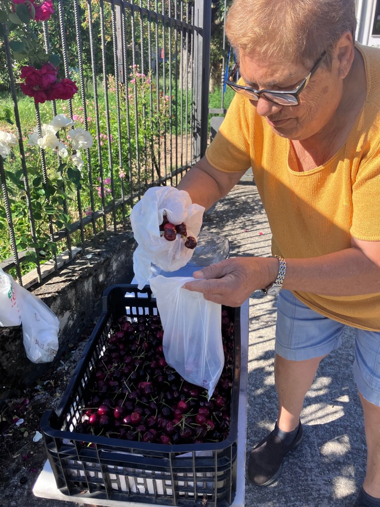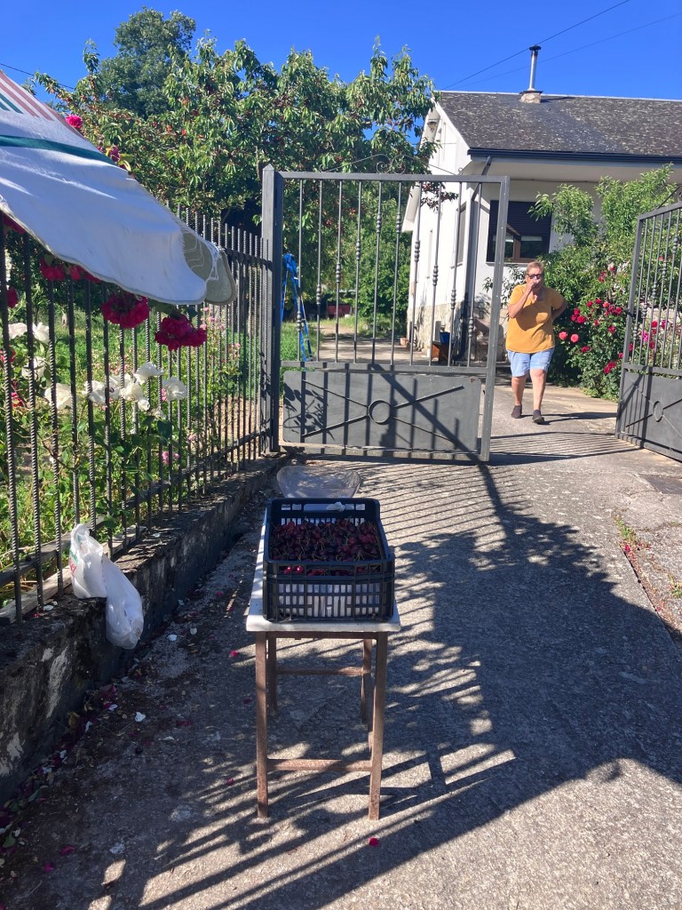 Today’s conversation went on much longer. Maybe it was the cherries. We sat on the steps of an abandoned house and ate and spit the stones. Whenever someone passed – whether a pilgrim or a local resident I offered them a handful – it seemed the bag would never empty!