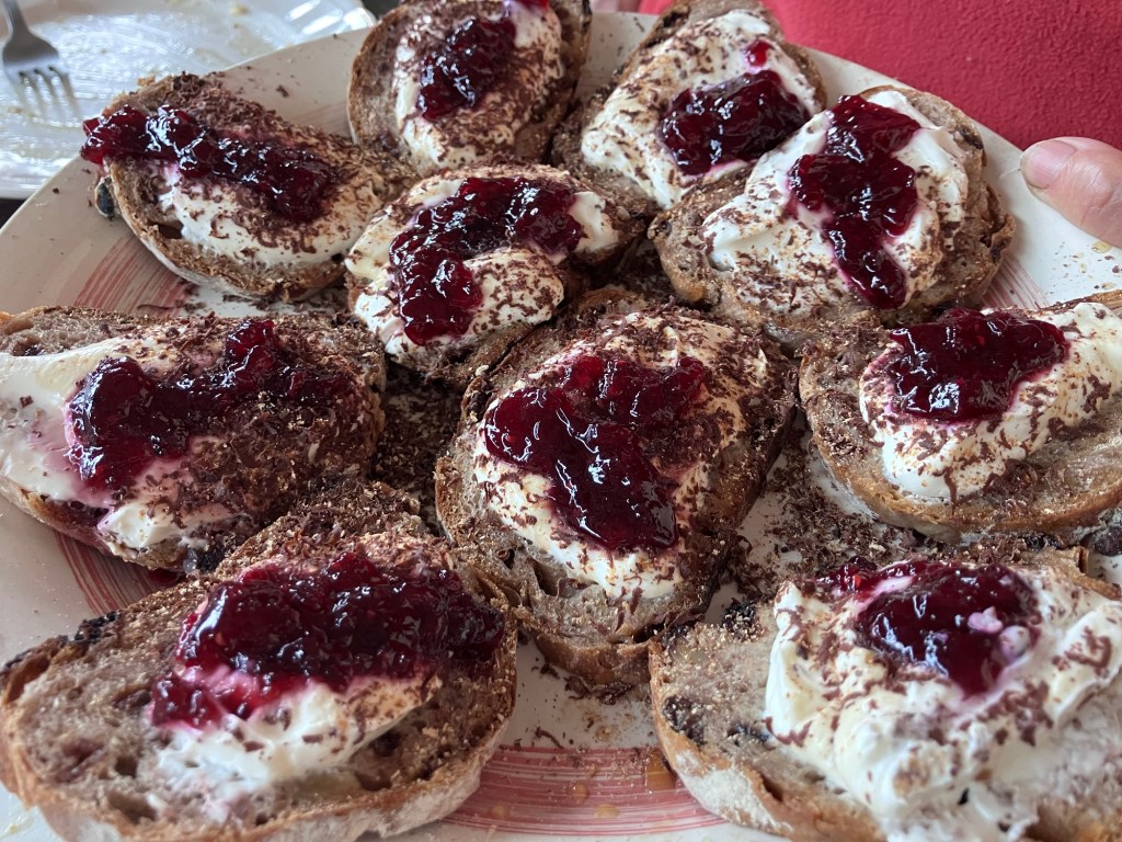 Raisin and nut bread with Greek yoghurt, homemade jam and grated chocolate for dessert.