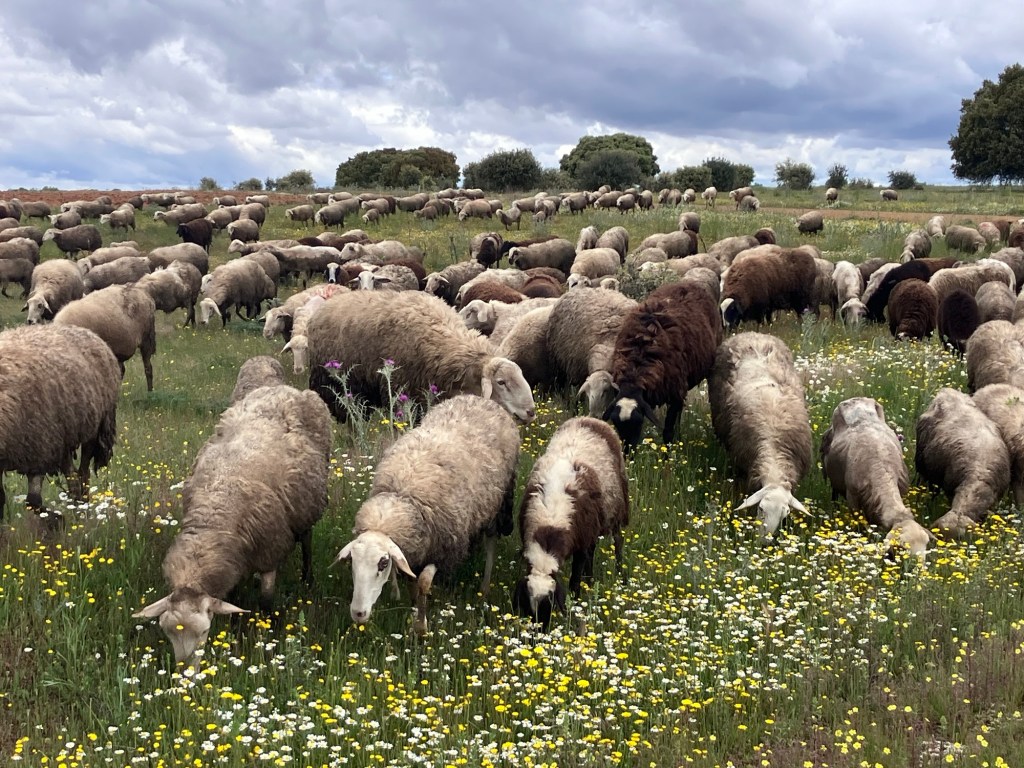 Suddenly a Very Large Dog…and I am not exaggerating – he stood as high as my ribs – came lumbering towards me. He looked happy enough, but I was a bit concerned by his size and talked gently to him as I stopped to show him I meant no harm to his charges. His smaller colleague, however, was not to be so easily dissuaded. He approached with ferocity, and a growl that meant business. There was nothing gentle about him. I didn’t feel so confident about his intentions and figured he might be about to make an object lesson of me to the yapping little bundle of bounce that was accompanying the two veterans. “Hola perro, you’re a nice big doggie, aren’t you?” was not going to cut it. I raised my sticks and my voice simultaneously, hopefully enough to convince the dog he didn’t want to eat me, but not so much as to annoy the dogs’ owner. Across the meadow came a shout and both dogs backed off. I inched forward, keeping a watchful eye on the canines, who no longer objected to me getting up close and personal with the sheep. Imagine bells ringing and a chorus of satisfied baas as you look at this picture.