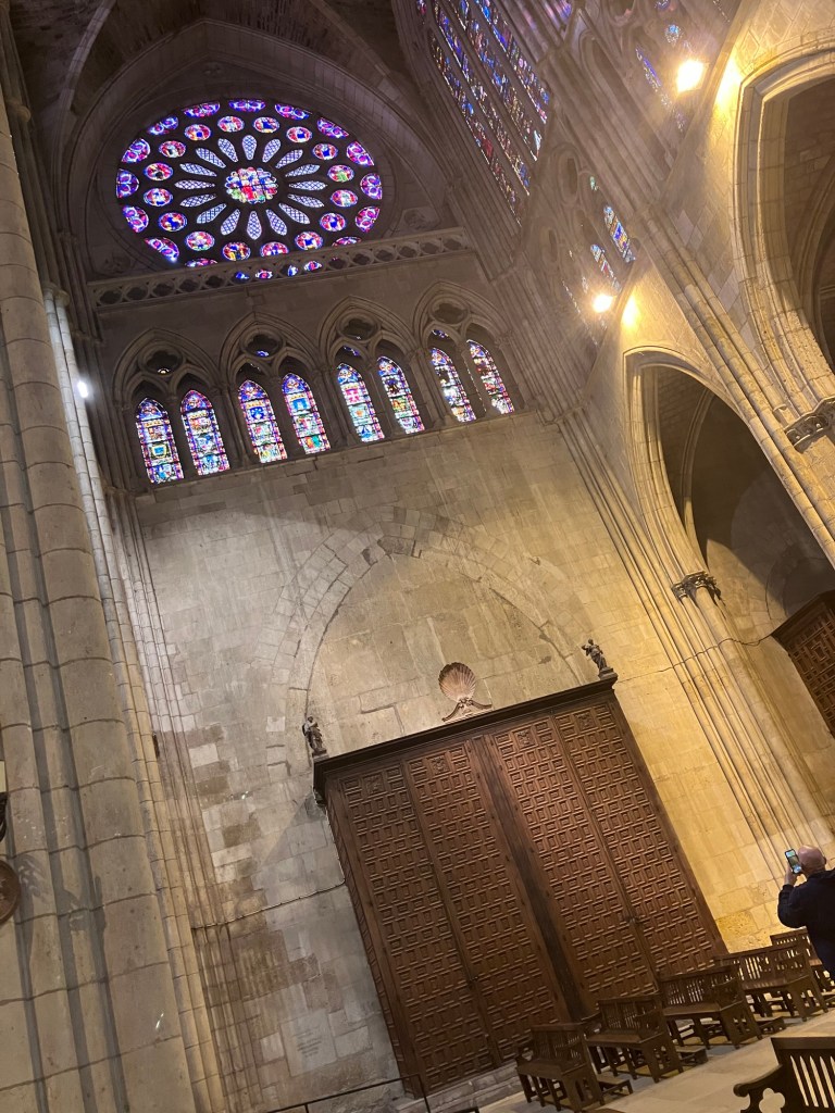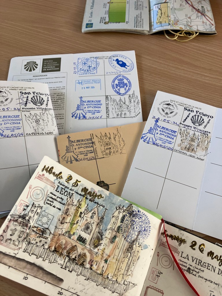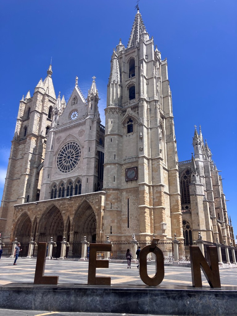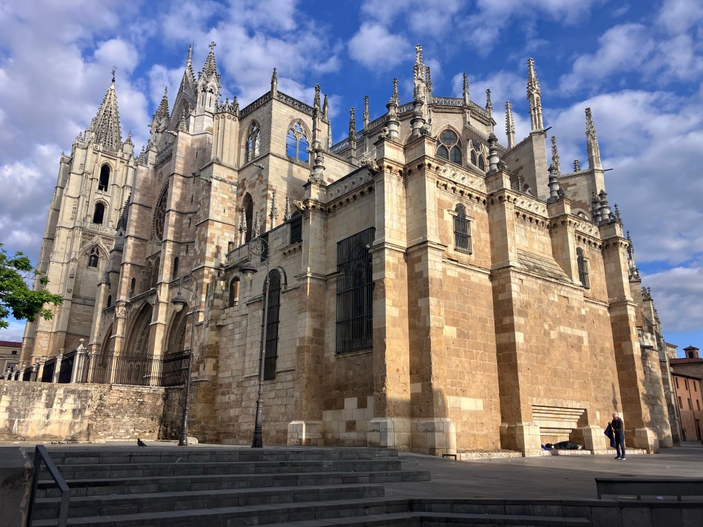 But I’m here, marking another milestone. I have been thinking of this camino in terms of cathedrals – Pamplona, Burgos, León, Astorga, Santiago. Here I am at the middle one. This is where we intended to start our first camino, the one with all eight kids and Grandpa back in 2012. After a week seeing the sights in Paris we had taken an overnight bus from there to León, and when we got here we didn’t immediately see a yellow arrow as we had been promised and we couldn’t even see the cathedral towers, so we booked the next bus to Astorga, figuring it would be easier to start somewhere smaller. It was! Then when four children and I walked this way in 2014, we turned right at León to head up the San Salvador. The next time we were here we were repeating that same route. So León to Astorga is unfinished business. Astorga is not only a cathedral city, but also marks the end of the meseta, and so I’ll have a special post to celebrate that. GraphGuy has been busy at work behind the scenes for that – you’re in for another treat.