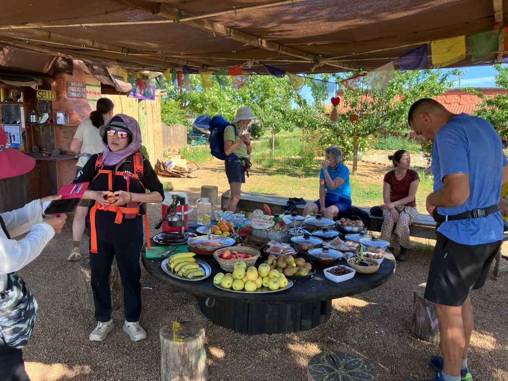There was such a spread of food and beverages – tea, coffee, water, oranges to juice, cheese, breads, biscuits, a variety of nuts in their shells, olives, watermelon, apples, pears, peaches, nectarines, bananas, cakes, crackers, chips… all for however much you might choose to donate.