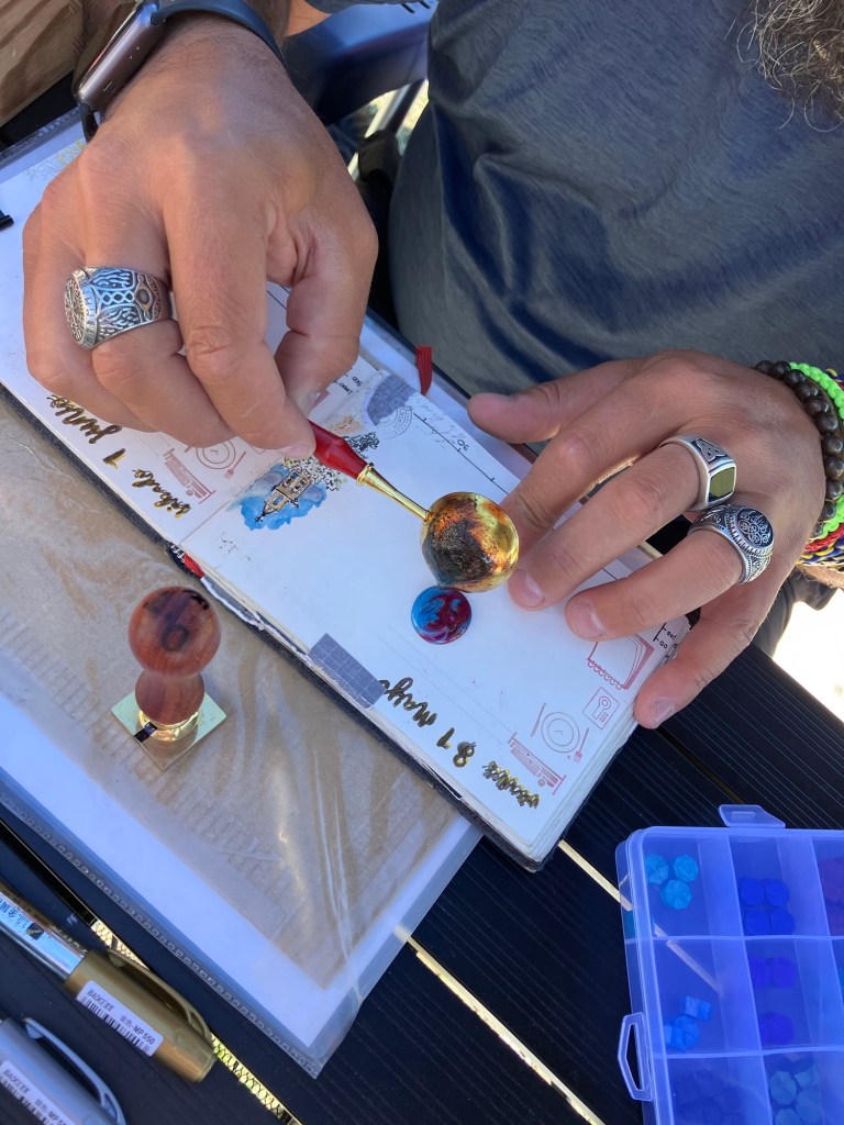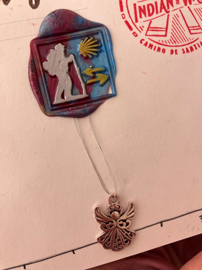 The queue for his services was quite long – I hope he was making a good living. He took a liking to my journal and added a little dangly angel that I hadn’t seen him put on any of the other credentials.