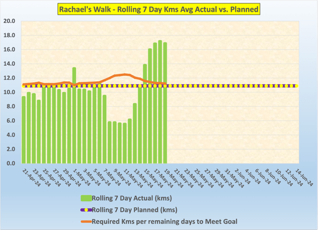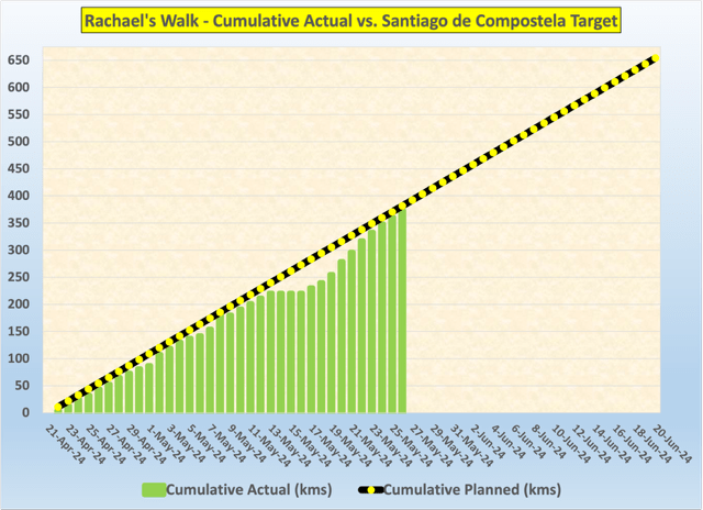 Quick update on two graphs prior to your official end to the Meseta…also to introduce a new line in Orange on the Rolling 7 Day Graphs. The new line is “Required Kms per day to meet to meet Goal”. The Goal being Santiago de Compostela on June 20th….2024.